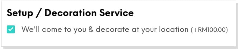 1. For our decoration packages, you can directly book it as an add-on. We’ve made it this way, because the decoration service is not necessary. Everything will be delivered ready-made and you can decorate it by yourself, at a lower cost. If you do want us to decorate it for you, just select the following option.